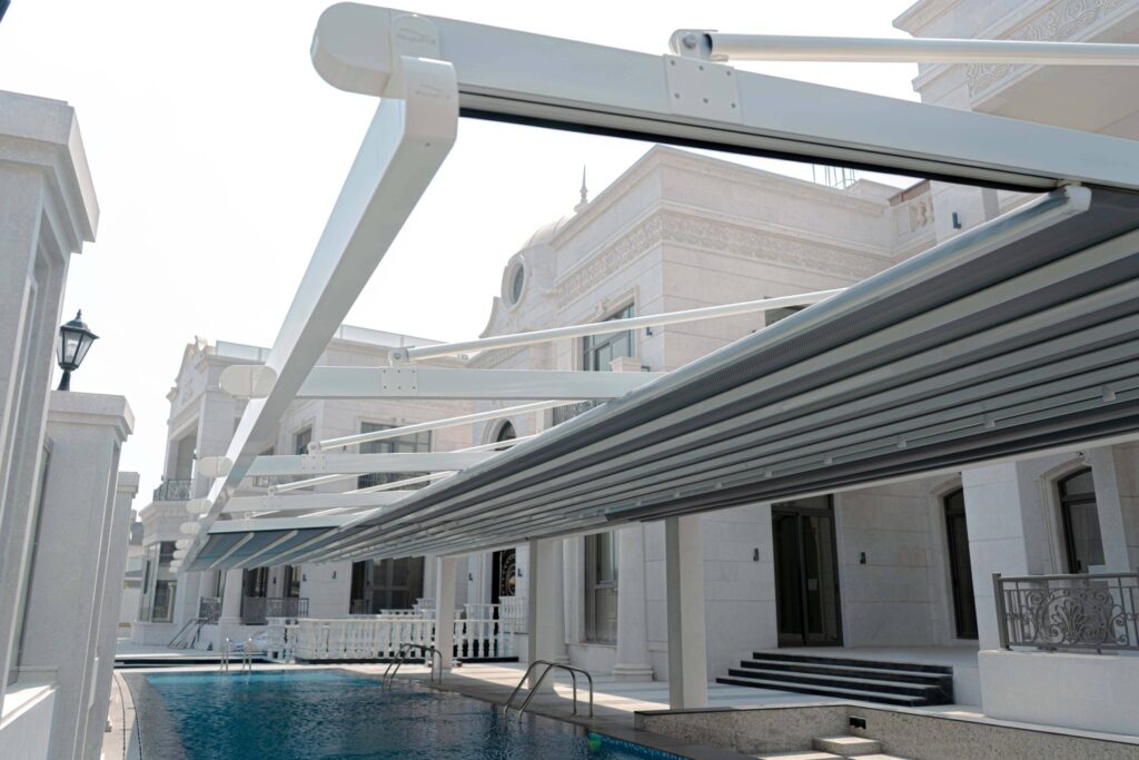 Retractable pergolas enhance the visual appeal of pool areas. Their clean lines and minimal design integrate seamlessly with modern villa architecture, adding both functionality and aesthetic value.