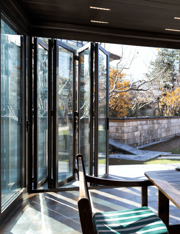 Folding glass systems are ideal for pergolas, villas, restaurants, and hospitality spaces that require complete openness when desired.