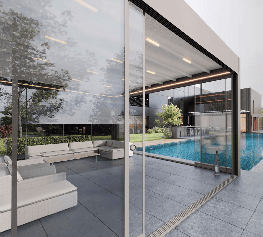 Designed for integration with pergolas and modern structures, these glass systems enable year-round outdoor living while preserving transparency, flexibility, and refined design.
